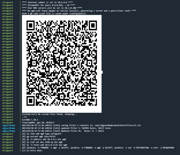DWG - CLI Обсуждение DWG » | DWG-CLI » | DWG-UI » | DWG-DARK » | DWG [multi] » Сборка DWG-CLI на базе того же скрипта DWG, но в составе используется стандартный WireGuard без надстроенного веб-интерфейса, сборка DWG-CLI включает в себя: Контейнер c Unbound предоставляет собственный DNS сервер с кэшированием DNS и дополнительными параметрами конфиденциальности. Контейнер c AdGuard Home (более современный аналог чем PiHole) используется для блокировки рекламы, аналитических трекеров и редактирования списка используемых DNS серверов к которым обращается Unbound. Имеет очень полезную функцию параллельных запросов, DNS которой нет в PiHole. Контейнер с WireGuard используется непосредственно для запуска серверной части Wireguard VPN Основные репозитории с обновлениями на GitHub: GitHub - DigneZzZ/dwg: dwg-universal GitHub - DigneZzZ/dwg-cli: Docker WireGuard with Adguard and Unbound Требования: Чистый пустой сервер. Поддерживаемые операционные системы (где проверена работоспособность): Ubuntu 20.04, 22.04, 23.10, Debian 11, 12 Скрипт устанавливает все автоматически. Все комментарии по скрипту внутри в комментариях. Команда установки: apt update && apt install curl sudo git -y && curl -Of https://raw.githubusercontent.com/DigneZzZ/dwg-cli/main/setup.sh && chmod +x setup.sh && ./setup.sh Что установится: Сначала установится Git, чтобы можно было скопировать мой репозиторий Docker - последняя версия Docker-compose - последняя версия Wireguard - интерактивный режим введения количества пользователей (имена\количество) AdGuard Home - интерактивный режим создания пользователя и пароля (можно оставить стандартным) Unbound - все в стоке apache2-utils - необходим для генерации хэш-паролей ssh.sh - скрипт для смены порта SSH подключения ufw.sh - скрипт для установки UFW Firewall. peer.sh - выводит список пиров и выводит настройки В ответных командах терминала будут QR-коды, которые вы можете использовать (если хотите) для настройки клиента WireGuard на своем телефоне. Также вы можете использовать следующую команду для вывода информации о пирах предварительно перейдя в папку dwg-cli cd dwg-cli ./p.sh Скачать конфигурационные файлы клиента для подключения к WireGuard вы можете через SFTP при помощи FileZilla или другого SFTP клиента. Конфигурации расположены в папках Peer1, Peer2 и т.д. по пути /user/dwg-cli/wireguard (вместо *user* ваше имя пользователя linux) Файл с расширением .conf используется в основном для подключения с ПК и содержит текстовую информацию для подключения клиента WireGuard. Также его можно использовать для импорта туннелей из файла. Файл с расширением .png это сохраненные QR коды для быстрого подключения клиента WireGuard с мобильного устройства. Данные для входа в панель управления AdGuard Home (по умолчанию): # Логин и пароль AGH по умолчанию могут отличаться, всегда проверяйте документацию сборки на GitHub http://10.2.0.100 или http://agh.local login: admin password: admin # или такой логин-пароль login: admin password: 12345678 # Скрипт для смены пароля AGH bash <(wget -qO- https://raw.githubusercontent.com/DigneZzZ/dwg/main/change.sh)