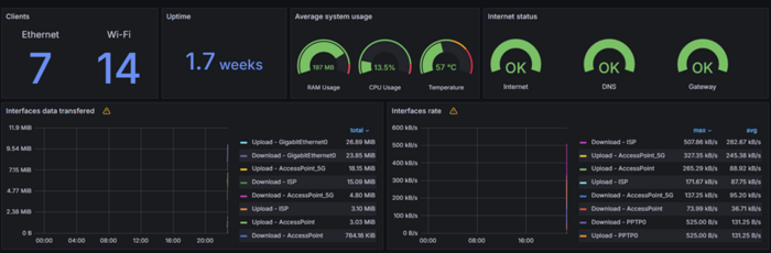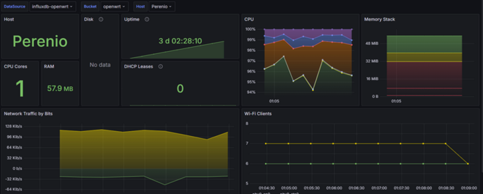 Вступление Это четвертая часть о мониторинге домашней системы с использованием influxdb и grafana первая часть про общую настройку и вторая часть про мониторинг proxmox, третья часть про мониторинг роутеров кинетик. Теперь заключительная часть про мониторинг openwrt. Продолжая обсуждение мониторинга состояния системы, необходимо уделить внимание важному аспекту – мониторингу состояния роутеров. Они являются одними из ключевых и критически важных элементов в вашей системе. В данной публикации я рассмотрю вопрос мониторинга состояния роутеров под управление системы openwrt с использованием пакета collectd. Настройка выполнялась на базе версий openwrt 22.03 и 23.05 Глобально у нас есть несколько вариантов настройки сбора статистики с роутеров: Сбор с помощью collectd и передача через telegraf установленный на роутере Сбор с помощью collectd и передача через telegraf установленный на отдельном сервере Сбор и отправка данных через telegraf Первый и третий вариант требуют установки на каждый роутер достаточно крупного пакета telegraf (урезанная версия весит 12 Mb), а место на многих роутерах очень ограничено. По этой причине я выбрал вариант 2. В общей суме нам потребуется около 1.5-2Мб памяти на роутере для пакетов статистики и одна установка telegraf для агрегации всех данных с нескольких роутеров. Настройка сбора статистики на роутере В первую очередь нам необходимо установить пакеты сбора статистики и collectd а так же модуля для них. Это можно сделать через графический интерфейс, или подключившись по ssh. Команды установки: opkg update opkg install luci-app-statistics collectd collectd-mod-cpu collectd-mod-conntrack collectd-mod-df collectd-mod-dhcpleases collectd-mod-interface collectd-mod-iwinfo collectd-mod-load collectd-mod-memory collectd-mod-network collectd-mod-uptime collectd-mod-rrdtool /etc/init.d/luci_statistics enable /etc/init.d/collectd enable После установки повторно заходим в интерфейс роутера в новый раздел меню статистика – настройки. В основных настройках обязательно указываем уникальное имя хоста (под этим именем данные будут собираться в системе influxdb) Нам необходимо включить все компоненты сбора статистики. Все настройки плагинов можно оставлять в режиме по умолчанию. При открытии окна настроек плагина может сбиваться состояние настроек и полей. Переходим к настройке плагинов вывода, перед настройкой плагинов вывода обязательно примените настройки. Выключаем плагин RRDTool, он отвечает за хранение статистики на устройстве для вывода в виде графиков. И переходим к настройке плагина network. Нам необходимо заполнить только параметры интерфейса telegraf, который будет принимать данные collectd. В моем случае это 192.168.0.137. Сам telegraf может находиться на любом устройстве сети не зависимо от роутеров и Influxdb. Настройка сбора данных в telegraf Для сбора информации с роутеров будем использовать вариант запуска программы telegraf в роли прокси ретранслятора, на вход будет поступать информация от роутеров, а на выходе формироваться запись для передачи в influxdb. Но перед запуском докер контейнера telegraf нам необходимо забрать с роутера файл для сопоставления наборов данных collectd. По умолчанию файл размещен по пути /usr/share/collectd/types.db Скачиваем его себе на сервер где будет запускаться telegraf, в моем примере это /docker/telegraf-openwrt/types.db Переходим к настройке telegraf. Заходим в influxBD и создаем новую корзину openwrt и конфигурацию telegraf. Нам нужен источник данных socket listener Заменяем шаблонный конфиг, и даем понятное название # Generic socket listener capable of handling multiple socket types. [[inputs.socket_l