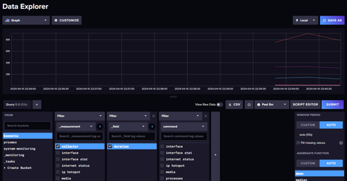 Это третья часть о мониторинге домашней системы с использованием influxdb и grafana первая часть про общую настройку и вторая часть про мониторинг proxmox Вступление Продолжая вопрос мониторинга состояния системы необходимо обсудить еще не маловажный вопрос мониторинга состояния роутеров в вашей системе как один из самых важных и критических элементов системы. В данной заметке рассмотрим вопрос мониторинга роутеров keenetic а в следующей мониторинг роутеров openwrt. Решения для других систем рассматриваться не будут так как я являюсь приверженцем именно этих двух систем и других устройств у меня нет. Все настройки будут выполняться на актуально на текущий момент времени версии KeeneticOS 4.1.3 У кинетика есть достаточно удобное и хорошее API у роутеров из коробки но по умолчанию он закрыт файрволлом, именно используя данное restfull api можно получить всю необходимую нам информацию даже для роутеров без entware. Для решения задачи мониторинга я буду использовать проект https://github.com/vitaliy-sk/keenetic-grafana-monitoring Подробная инструкция по созданию новых корзин и api токенов было разобрано в первой и второй части, так что в данной публикации будет крайний минимум побочной информации. Настройка мониторинга роутера В рассматриваемом решение применяется подход обращения к API или авторизации и использования cli запросов. Я не вижу смысла использовать авторизацию с запросами так как api работает постоянно и не нагружает дополнительно систему в отличии от постоянных запросов через cli. Первым этапом откроем доступ к API на роутере, для подключения из локальной сети не требуется авторизация. Идем в настройки нашего роутера в раздел переадресация портов И создаем новое правило переадресации портов Обратите внимание на подсеть, в моем случае это 192.168.0.1 у вас она может отличаться. Фактически на стороне роутера настройка закончена теперь нам доступно api по адресу http://192.168.0.1:81/rci/show/system Настройка сбора данных в influxDB Теперь приступим к разворачиванию системы, которая будет обращаться к нашему api и пересылать в influxdb. В первую очередь создадим новую корзину данных для хранения в моем случае это keenetic. И создадим custom api токен на запись данных. Особенность сборщика не позволяет разделить данные от нескольких роутеров в одной корзине по hostname по этому для каждого роутера который необходимо мониторить делаем отдельную корзину данных. При копировании API токена проверяем, кнопка может отработать не корректно. Мониторинг запускается в отдельном докер контейнере на любом сервере в сети, в моем случае я буду запускать его на той же виртуальной машине, где у меня запущен influxdb. Я буду размещать файл конфигурации по пути /docker/keentic-monitoring/config.ini для этого создам советующие папки и файл. mkdir /docker mkdir /docker/keentic-monitoring nano /docker/keentic-monitoring/config.ini Заполняем данные в шаблон конфигурационного файла. Указываем адрес базы influxdb, токен, организацию и bucket. [influx2] # If you are using docker-compose it should be http://influxdb:8086 url=http://192.168.0.135:8086 # For influx v1.x please use "-" as a value org=influxdb # For influx v1.x please use "username:password" as a token # See DOCKER_INFLUXDB_INIT_ADMIN_TOKEN in docker-compose.yml token=<Token> timeout=6000 # For influx v1.x DB name bucket=keenetic [keenetic] admin_endpoint=http://192.168.0.1:81 skip_auth=true login=admin password= [collector] interval_sec=30 Запускаем докер контейнер со следующими параметрами Я использую docker compose из интерфейса portainer по этому привожу только файл запуска docker compose. Подробную инструкцию как запустить docker compose из файловой системы легко найти на 