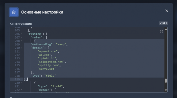 Продолжаем тему установки Marzban. 1. Включаем поддержку warp proxy в ядре xRay Для чего это нужно? Как я уже писал в других темах, это нужно для возможности обхода региональных блокировок на стороне того сайта, к которому вы обращаетесь, например, OpenAI.com. Можно установить двумя способами, тот который я уже описывал на форуме (полностью ручной) и с помощью скрипта. Напишу самый простой. Установка WARP-cli С февраля автор больше не поддерживает свой инструмент. bash <(curl -fsSL https://raw.githubusercontent.com/DigneZzZ/warp.sh/main/warp.sh) proxy Легко и просто. 2. Рекомендуемый конфиг для VLESS TCP REALITY. Я рекомендую вам остановиться на одном единственном типе подключений - VLESS TCP REALITY. Работает, не блокируется. Ниже приведен лучший (на мой взгляд) вариант конфигурации. Он уже включает в себя проксирование через WARP. { "log": { "loglevel": "warning" }, "inbounds": [ { "tag": "VLESS TCP REALITY", "listen": "0.0.0.0", "port": 8443, "protocol": "vless", "settings": { "clients": [], "decryption": "none" }, "streamSettings": { "network": "tcp", "tcpSettings": {}, "security": "reality", "realitySettings": { "show": false, "dest": "flickr.com:443", "xver": 0, "serverNames": [ "flickr.com" ], "privateKey": "OGWADIQSFq3tUHrUTOug8mUQqG7OZeoKZR5Hv3LdmVg", "shortIds": [ "bbc0e34bc74e6183" ] } }, "sniffing": { "enabled": true, "destOverride": [ "http", "tls" ] } } ], "outbounds": [ { "protocol": "freedom", "tag": "DIRECT" }, { "tag": "WARP", "protocol": "socks", "settings": { "servers": [ { "address": "127.0.0.1", "port": 40000 } ] } }, { "protocol": "blackhole", "tag": "BLOCK" } ], "routing": { "rules": [ { "type": "field", "outboundTag": "WARP", "domain": [ "openai.com", "spotify.com" ] }, { "ip": [ "geoip:private" ], "outboundTag": "BLOCK", "type": "field" }, { "domain": [ "geosite:private" ], "outboundTag": "BLOCK", "type": "field" }, { "protocol": [ "bittorrent" ], "outboundTag": "BLOCK", "type": "field" } ] } } Для установки, заходим в вашу панель. Жмём на шестиренку: Открывается: Заменяем все содержимое на код который указывал выше. Теперь главное, обратите внимание на эти два значения: "privateKey": "OGWADIQSFq3tUHrUTOug8mUQqG7OZeoKZR5Hv3LdmVg", "shortIds": [ "bbc0e34bc74e6183" Вам для своего сервера, эти значения нужно указать самостоятельно. Для получения privateKey, нужно использовать на сервере команду: docker exec marzban-marzban-1 xray x25519 Для получения ShortIDs, нужно их сгенерировать вот этой командой: openssl rand -hex 8 и заменяем его в параметрах. Резервный вариант подключения - Trojan WS. Я бы рекомендовал его иметь в запасе, но не назначать каждому. Вот код, который нужно вставить сразу после "inbounds": [ { "tag": "TROJAN WS TLS", "listen": "0.0.0.0", "port": 2058, "protocol": "trojan", "settings": { "clients": [] }, "streamSettings": { "network": "ws", "wsSettings": { "path": "/" }, "security": "tls", "tlsSettings": { "serverName": "SERVER_NAME", "certificates": [ { "ocspStapling": 3600, "certificateFile": "/var/lib/marzban/certs/fullchain.pem", "keyFile": "/var/lib/marzban/certs/key.pem" } ], "minVersion": "1.2", "cipherSuites": "TLS_ECDHE_ECDSA_WITH_CHACHA20_POLY1305_SHA256:TLS_ECDHE_RSA_WITH_CHACHA20_POLY1305_SHA256:TLS_ECDHE_ECDSA_WITH_AES_256_GCM_SHA384:TLS_ECDHE_RSA_WITH_AES_256_GCM_SHA384:TLS_ECDHE_ECDSA_WITH_AES_128_GCM_SHA256:TLS_ECDHE_RSA_WITH_AES_128_GCM_SHA256" } } }, В чем плюс использования единого инбаунда? Всё просто, вы можете варьировать теги по системе в дальнейшем как вам угодно, и очень удобно подключать и использовать ноды (расскажу в отдельной статье) Если есть вопросы и пожелания, пишите!
