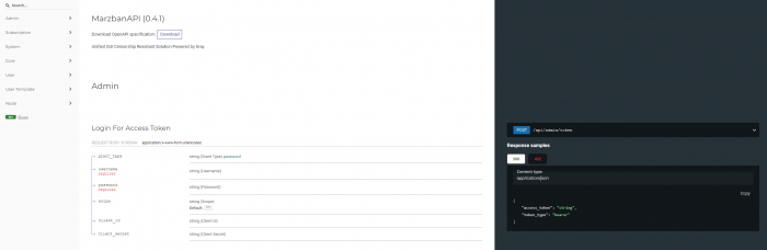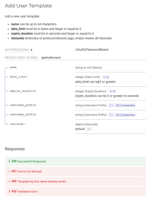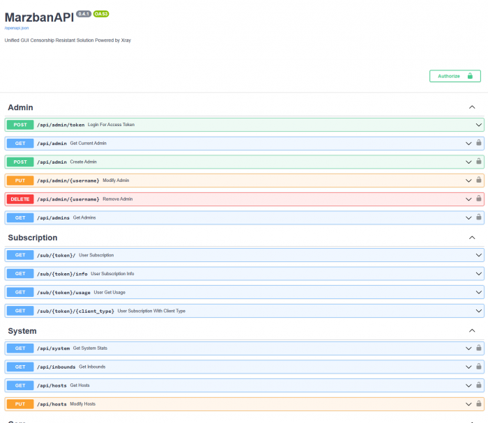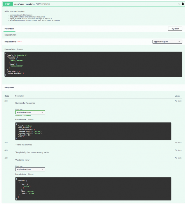 Что дают шаблоны? При использовании телеграм-бота, вы можете очень быстро создавать пользователей, просто указав его имя. Все остальные настройки уже будут переопределены. Есть кнопки: Create from template и кнопка Charge при заходе в пользователя: Все они, используют шаблоны пользователей, которые мы создадим Для того чтобы активировать шаблоны в телеграм, и удобно их использовать, вам нужно сначала включить эту возможность в .env. 1. Редактирование .env nano /opt/marzban/.env Находим строку: # DOCS = true и убираем комментарий со строки, чтобы получилось просто: DOCS = true 2. Перезапуск marzban marzban restart -n атрибут -n используется, чтобы не открывать логи после перезапуска. 3. Переходим в панель. Идём по адресу: https://domain.ru/docs А почитать информацию по API вы можете по ссылке: https://domain.ru/redoc Попадаем на такую страницу: Да, это именно веб-реализация API менеджмента. Удобно! Но первым делом, нам нужно авторизоваться. Жмем кнопку: Указываем свой логин и пароль от дэшборда: И жмём внизу: 4. Редактирование через АПИ шаблона пользователей. Нас интересует раздел: 4.1. Раскрываем раздел Add User Templates: 4.2. Жмем справа сверху - Try it Out И откроется тело запроса: из /redoc: 4.3. Теперь мы должны указать необходимые параметры. По умолчанию текст тут такой: { "name": "my template 1", "inbounds": { "vmess": [ "VMESS_INBOUND" ], "vless": [ "VLESS_INBOUND" ] }, "data_limit": 0, "expire_duration": 0 } name - задаем имя шаблона, короткое но понятное вам, например, 30 days / 300 gb inbounds - здесь мы должны указать теги наших подключений. В нашем случае тег будет: VLESS TCP REALITY data_limit - здесь мы должны задать размер доступного трафика, в байтах. Здесь есть один большой минус. Трафик указывайте в байтах. Придётся в панеле задавать вручную. data_limit_reset_strategy - Это стратегия сброса лимитов. Возможные варианты: no_reset / day / week / month / year Например, 300Гб = 322122547200 Байт Если задано 0 - значит без ограничений expire_duration - Время действия, в СЕКУНДАХ! Также можем указать для создаваемого пользователя username_suffix и username_prefix. Но зачем, я не понимаю )) В нашем случае для 30 days и 300 гб, запрос будет таким: { "name": "30 days/300gb", "inbounds": { "vless": [ "VLESS TCP REALITY" ] }, "data_limit": 322122547200, "expire_duration": 2592000 } Теперь осталось нажать синию кнопку: Получаем результат: Можно идти и проверять в Telegram бота. Обратите внимание на id: 9 Он вам пригодится, если вы захотите удалить какой то шаблон. 5. Удаляем шаблон. Удалить шаблон, также легко. Достаточно знать его ID. Нам нужен соответствующий раздел: Жмем сверху: Пишем ID = 9 (в нашем примере) и жмем Execute Удалили. Со всем остальным использованием API действия такие же!