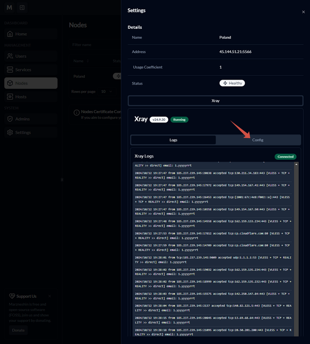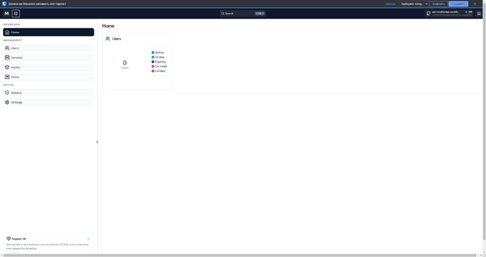 Установим ноду для Marzneshin 1. Сервер возьмем у ребят: https://procloud.ru?referral_id=274473 2. Зайдем на сервер, и выполним команду: apt-get update -y && apt-get upgrade -y && curl -fsSL https://get.docker.com | sh && git clone https://github.com/khodedawsh/marznode && cd marznode && docker compose up -d Она сделает следующее: Установит обновления на сервер установит докер сделает клон репозитория поднимет контейнер 3. Идем в панель Marzneshin и копируем сертификат 4. Возвращаемся в нашу ноду и Создаем файл с сертификатом: nano /var/lib/marznode/client.pem Сертификат скопированный в буфер на 3 шаге вставляем нашу ноду: 5. Скачиваем и распаковываем ядро Xray в следующую директорию: cd && mkdir -p /var/lib/marznode/data && cd /var/lib/marznode/data wget https://github.com/XTLS/Xray-core/releases/latest/download/Xray-linux-64.zip && unzip Xray-linux-64.zip && rm Xray-linux-64.zip 6. Перемещаем файл xray_config.json с помощью следующей команды: cp /root/marznode/xray_config.json /var/lib/marznode/xray_config.json 7. Перемещаем исполняемый файл Xray командой: cp /var/lib/marznode/data/xray /var/lib/marznode/xray 8. На этом этапе нужно отредактировать Docker файл: cd && cd marznode rm -rf compose.yml && nano compose.yml 9. На этом этапе вставляем и сохраняем содержимое Docker файла: services: marznode: image: dawsh/marznode:latest restart: always network_mode: host environment: SERVICE_PORT: "5566" XRAY_EXECUTABLE_PATH: "/var/lib/marznode/xray" XRAY_ASSETS_PATH: "/var/lib/marznode/data" XRAY_CONFIG_PATH: "/var/lib/marznode/xray_config.json" SSL_CLIENT_CERT_FILE: "/var/lib/marznode/client.pem" SSL_KEY_FILE: "./server.key" SSL_CERT_FILE: "./server.cert" volumes: - /var/lib/marznode:/var/lib/marznode Сервисный порт для подключения задаем 5566, но вы можете любой другой 10. Перезапускаем контейнер: docker compose down && docker compose up -d 11. Возвращаемся в панель: 12. Заполняем параметры: В чем разница между grpclib и grpcio? Каждый из них представляет собой реализацию grpc на Python, каждый из которых имеет свои проблемы. grpcio - это реализация с асинхронными методом, поэтому для большого количества пользователей и запросов - это приоритетный вариант 13. Получаем подключенную ноду: 14. Кликаем на нее и переходим на вкладку Config 15. Заполяем конфиг как считаете необходимым. 16. Идем на вкладку Hosts и создаем/редактируем подключение как хотим: 17. Идем на вкладку Services и создаем новую сущность: 18. Вводим имя и отмечаем наши Inbounds. 19. Создаем нового пользователя на вкладке Users: Обязательно отмечать дата истечения срока (синяя рамка) - иначе будет ошибка создания. 20. На этом в принципе все. Уже можно пользоваться.