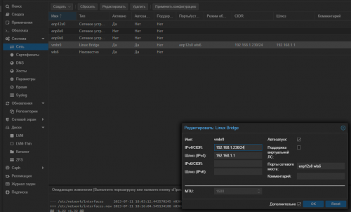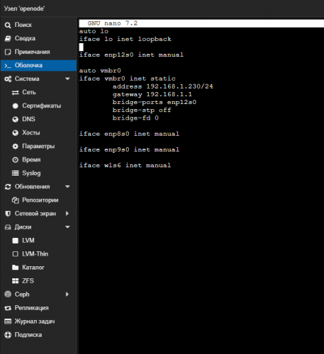 Всем привет Решил немного отдельных тематических тем создать под задачи с которыми сталкиваюсь, и как решаю. В общем. Сейчас у меня сервер подключен по кабелю через пол квартиры, иначе никак ни зайти ни настроить. Учитывая что у меня куплен wifi адаптер в pcie слот, глупо им не пользоваться. Итак. Ставим WiFi на Proxmox 8. Это не сложно. Первым делом нам нужно установить два пакета для работы с Wi-Fi: apt-get install -y wpasupplicant apt-get install wireless-tools Узнаём конфиг по сетям для этого выполним команду: iwconfig Получим примерно такой вывод: Из чего понимаем, что нас интересует интерфейс связи wls6 (в моем случае) Далее идем редактировать файл /etc/network/interfaces nano /etc/network/interfaces У меня вид вот такой: Видим, что про wls6 нет ничего. Исправляем на такой вид дописав текст и закомментировав ненужную (изменяемую) строку: auto wls6 iface wls6 inet dhcp wpa-conf /etc/wpa_supplicant/wpa_supplicant.conf Теперь редактируем файл с параметрами подключения /etc/wpa_supplicant/wpa_supplicant.conf: nano /etc/wpa_supplicant/wpa_supplicant.conf Содержимое вставляем такое и заменяем названия сети и пароль к сети: country=RU ctrl_interface=DIR=/var/run/wpa_supplicant GROUP=netdev update_config=1 network={ ssid="your ssid" psk="your wifi password" scan_ssid=1 } Сохраняем файл, выходим и перезапускаем службу: sudo systemctl restart networking Кидаем в консоль команду ip a и видим, что у нас получилось подключиться к wifi: Отлично. Включаем службу в автозагрузку при перезапуске: systemctl enable wpa_supplicant.service Вам также необходимо запустить dhclient во время загрузки, чтобы получить частный IP-адрес от вашего DHCP-сервера. Этого можно достичь, создав сервисный блок systemd для dhclient: nano /etc/systemd/system/dhclient.service Вставляем туда код ниже, не забыв заменить интерфейс: /etc/systemd/system/dhclient.service * [Unit] Description= DHCP Client Before=network.target After=wpa_supplicant.service [Service] Type=forking ExecStart=/sbin/dhclient wls6 -v ExecStop=/sbin/dhclient wls6 -r Restart=always [Install] WantedBy=multi-user.target Теперь перезапускаем сервис: systemctl restart wpa_supplicant.service И ещё раз перезапускаем сеть: systemctl restart networking Теперь сетевой интерфейс доступен по этому адресу: 192.168.1.162:8006 Но, на этом ещё не все. Для правильности всех настроек, нам нужно провалиться в параметры сети: И указать в портах сетевого моста wls6 Чтобы применить изменения, нужно перезапустить наш узел = сервер: Узлом называется потому что мы можем собрать в одной сети несколько серверов в кластер. Кнопка сверху при активном "узле": Но, теперь если отключить сеть проводную - пропадет весь доступ... Получается, что по wifi-сеть не держится. Пока я не смог решить эту проблему Хоть и перенастроил bridge и оставил там только шлюзы для wifi... Если кто то сталкивался, подскажите UPD: Вероятная причина в отсутствии драйверов для моей сетевой карты TP-LINK T5E - нет поддержки Linux