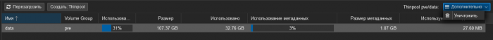 В процессе переноса системы proxmox на новый SSD большего объема я оставлю здесь краткое пошаговое руководство, которое может оказаться полезным кому-то: Для переноса данных было использовано приложение Acronis True Image на операционной системе Windows. !!! Внимание скриншоты сделаны пост фактум и добавлены только для общего понимания процесса, вывод будет похожим но в моем случае распределение уже было выполнено !!! 1.1. Установлен старый SSD диск в основной компьютер с Windows. 1.2. Создана резервная копия файлов со старого диска (необходимо включить все разделы, так как Windows не видит файлы настроек: Дополнительно - Режим создания - Архивирование в посекторном режиме). 1.3. Установлен новый SSD в компьютер и запущено восстановление диска с параметрами: Дополнительно - Восстановление по секторам. 2. Установленный SSD диск был установлен в сервер, система загрузилась, используя новый SSD. Следующим шагом было расширение полученного диска для использования всего доступного пространства. 2.1. Определяем, в каком диске находятся наши данные proxmox, используя команду: lsblk В данном случае, это был диск sda и раздел sda4. 2.2. Производим расширение раздела: fdisk /dev/sda Просматриваем текущую структуру разделов с помощью команды: p. Запоминаем начальный сектор раздела sda4, так как новый раздел должен начинаться с этого же сектора. Удаляем раздел с помощью команды: d, указываем раздел: 4. Создаем новый раздел с помощью команды: n. Начало нового раздела должно совпадать с начальным значением раздела, которое мы запомнили ранее. По умолчанию предлагается использовать все доступное пространство для нового раздела, с чем мы соглашаемся. На вопрос о удалении метки отвечаем "N", но метка все равно будет повреждена. Поэтому исправляем тип раздела 4 на Linux Filesystem с помощью команды: t с указанием типа 43. Сохраняем изменения с помощью команды: w, для выхода без сохранения используем: q. Перезагружаем хост: reboot Выполняем команду: pvresize /dev/sda4 После этой операции размер раздела sda4 должен увеличиться. Так же в веб интерфейсе proxmox мы должны увидеть похожу картину (!!! Обратите внимание скриншот сохранен после перераспределения в случае настройки на данном шаге у вас будет занято меньше пространства) После этого увеличиваем размер директории local-lvm которая используется для наших виртуальных машин. Обратите внимание pve это имя хоста оно может отличаться, его можно увидеть в том числе при выводе lsblk. lvextend -L +350G /dev/pve/data Увеличили размер на 350Gb и видим изменение в интерфейсе Все можем использовать расширенное пространство для развертывания новых виртуальных машин. Иногда бывает надо увеличить не только директорию local-lvm но и основную директорию local (она же root) которую использует proxmox для хранения временных файлов. В такой ситуации команда будет выглядеть вот так: lvextend -L +10G /dev/pve/root Обязательно после изменения root директории необходимо выполнить реструктуризацию файловой системы командой resize2fs /dev/pve/root Еще один вариант задачи когда мы хотим сократить размер пула local-lvm, в таком случае безболезнено не получиться изменить. Нам необходимо освободить пул от данных. Для этого либо надо удалить все виртуальные машины либо мигрировать их на другой диск или пул. Для этого останавливаем виртуальную машину, и нам открывается доступ для изменения диска. Обязательно удаляем исходный (его потом можно удалить в этом же интерфейсе 