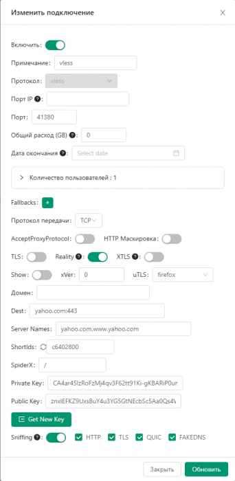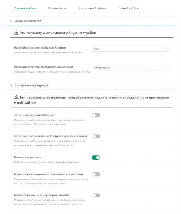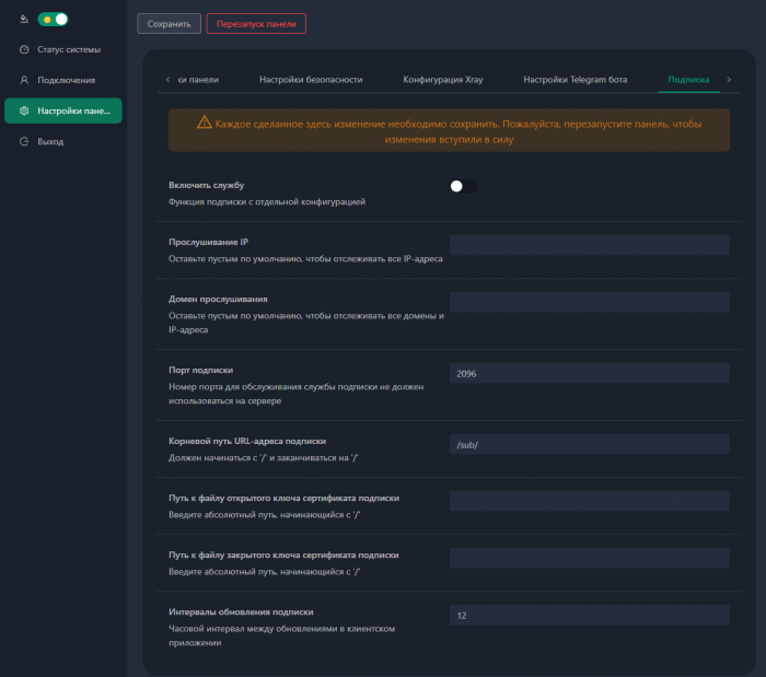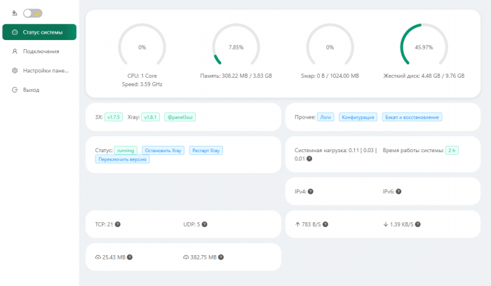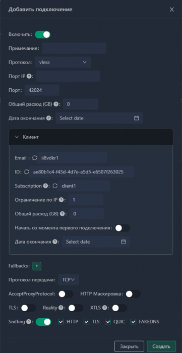 ShadowSocks решения: Marzban Quick | Marzban Full | Marzban Node | x-ui | 3x-ui | 3x-ui Docker Всем привет Проблема прилетела с утра мгновенная.. а вот решение я так и не описал. Начнем. Итак, перед нами задача. WireGuard блокируют в РФ потихоньку, нужны альтернативы. Сразу оговорюсь, свою сборку я пока не смог собрать с AdGuard-ом. Но стремлюсь к этому. Первым делом нам нужно арендовать хороший и быстрый сервер. Например можно рассмотреть: 1. Aeza: получаем бонус 15% (если пополнить в первые 24часа регистрации) на пополнение баланса: https://aeza.net/?ref=377137 2. На крайний случай 4vps: 4VPS.su (2Гб\с сервера) 1. Регистрируемся по ссылке. 2. Выбираем желаемую страну. Но по моему опыту тестирования всех локаций, самые лучшие скорости в РФ у серверов в Дании и в Швейцарии. 3. Получаем адрес, логин и пароль. 4. Заходим через SSH клиент. Самым навороченным на опции и с детальным веб-интерфейсом решением ShadowSocks является сборка 3x-ui от MHSanaei: MHSanaei/3x-ui: Xray panel supporting multi-protocol multi-user expire day & traffic & ip limit (Vmess & Vless & Trojan & ShadowSocks) (github.com) Установка простая. Установка от обычного x-ui не отличается практически ничем. Кто хочет x-ui без WARP Proxy, вот ссылка на репозиторий Юзаем команду (обращаю ваше внимание, установка не в DOCKER (как установить в Docker расскажу в отдельном посте, но информация есть на странице GitHub): Хочется отметить, что если вы ставите панель в докер, то могут возникнуть сложности с использованием команды x-ui вне контейнера. По умолчанию логин и пароль для контейнерной версии admin/admin bash <(curl -Ls https://raw.githubusercontent.com/mhsanaei/3x-ui/master/install.sh) Скрипт все сделает сам. В итоге уведомит и предложит создать пользователя: После заполнения простых действий получаем: Готово. Теперь можем ознакомиться с меню доступным из консоли: Нас интересует 15 пункт. SSL сертификат. (опция не обязательна. Но мы сделаем все командой с официальной страницы репозитория: apt-get install certbot -y certbot certonly --standalone --agree-tos --register-unsafely-without-email -d yourdomain.com certbot renew --dry-run Не забыв заменить свой домен. Теперь заходим по адресу который мы указывали (не забудьте открыть порт в UFW для вашего порта веб-интерфейса, который вы задали. Авторизовываемся: Получаем главный интерфейс: Идем сразу в настройки панели и переходим в раздел Подписки: Включаем её. Нам она нужна, чтобы на одного пользователя можно было цеплять сразу несколько типов подключений, и у пользователя они обновлялись динамически. К тому же, у каждого клиента появится свой кабинет с информацией для подключения. Также можно настроить и использование вашего телеграм бота. Она дает статистику использования для вас и ваших пользователей. Об этой опции расскажу позже, в детальном гайде. Пора создать наше подключение! Переходим в раздел подключения: Жмем Добавить: Обязательно заходим в опцию клиентов: Здесь мы выставляем Vless как протокол для клиента под email понимается его Имя subscription как раз позволит привязать к одному клиенту несколько типов подключений. Ограничение по IP - не дает заходить больше 1 устройства на 1 подключение. Оставляем остальное как есть. Жмем Создать. На этом в принципе всё из Базовых настроек и быстрого старта. Может доберутся ещё руки до большей детальности. Но пока, не плохая статья есть здесь: https://habr.com/ru/amp/publications/735536/ Отдельная история есть про WARP proxy для обхода региональных блокировок с Ру Хостеров. Писал об этом здесь. Продолжение темы 3x-ui с установкой Docker