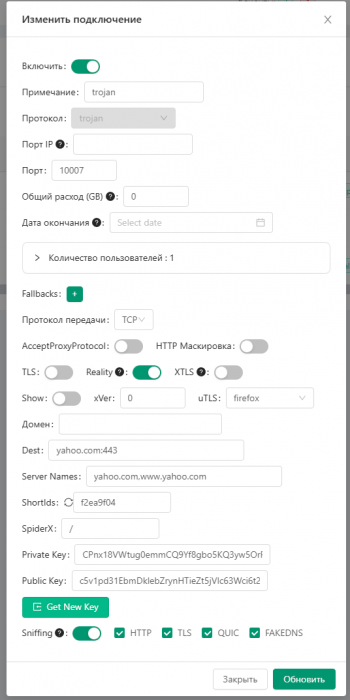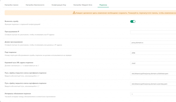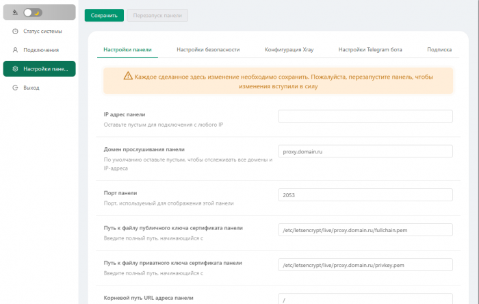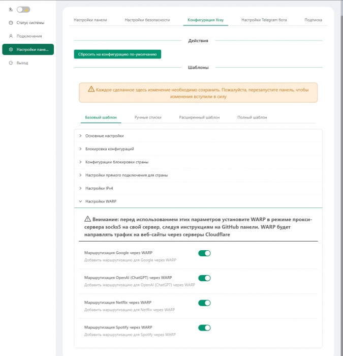 ShadowSocks решения: Marzban Quick | Marzban Full | Marzban Node | x-ui | 3x-ui | 3x-ui Docker Всем привет В продолжении прошлой темы. Решил опубликовать набор самых основных настроек и установки в докер. Первым делом нам нужно арендовать хороший и быстрый сервер. Например можно рассмотреть: 1. Aeza: получаем бонус 15% (если пополнить в первые 24часа регистрации) на пополнение баланса: https://aeza.net/?ref=377137 2. На крайний случай 4vps: 4VPS.su (2Гб\с сервера) 1. Теперь ставим docker. bash <(curl -sSL https://get.docker.com) 2. Клонируем репозиторий и падаем в него git clone https://github.com/MHSanaei/3x-ui.git cd 3x-ui 3. Заходим в docker-compose.yml и правим параметры: --- version: "3.9" services: 3x-ui: image: ghcr.io/mhsanaei/3x-ui:latest container_name: 3x-ui hostname: domain.org volumes: - $PWD/db/:/etc/x-ui/ - /etc/letsencrypt/live/domain.org/fullchain.pem:/root/cert/fullchain.pem - /etc/letsencrypt/live/domain.org/privkey.pem:/root/cert/privkey.pem environment: XRAY_VMESS_AEAD_FORCED: "false" tty: true network_mode: host restart: unless-stopped Нам нужно поменять hostname на ваш домен, и указать путь туда, где certbot будет генерировать ключи (строка - $PWD/cert/:/etc/letsencrypt/live/proxy.domain.ru/) Сохраняем и закрываем файл. (ctrl+o, enter, ctrl+x) 4. Выпускаем сертификаты к уже привязанному домену с помощью certbot. (Для управления домена и поддоменами рекомендую использовать Cloudflare, это очень удобно, быстро и комфортно) apt-get install certbot -y certbot certonly --standalone --agree-tos --register-unsafely-without-email -d proxy.domain.ru certbot renew --dry-run Получаем сообщение: Значит все хорошо. Если вы получили ошибку, проверьте домен или возможно привязка к IP не выполнилась ещё, подождите немного. 5. Назначаем разрешение на файлы в папке ключей: chmod 666 -Rf /etc/letsencrypt/live/proxy.domain.ru 6. Запускаем контейнер. docker compose up -d 7. Заходим в панель: http://proxy.domain.ru:2053/panel 8. Логин и пароль admin / admin Добро пожаловать в панель. 9. Сразу идем в настройки панели =- настройки безопасности и меняем пароль 10. Заходим в первую вкладку и пишем наши данные по домену и адрес к нашим ключам: Папка должна соответствовать тому что у нас в docker-compose.yml UPD: 09.08.23. Совладать с файлам ключей не получилось. Нужно скопировать 2 ключа из пути выше, в папку /root/3x-ui/cert/ командой: 10.2. Заходим в раздел подписок, включаем эту опцию и прописываем те же параметры домена и ключей (либо можете использовать отличный от основного домен) 11. Вернемся в нашу консоль. Теперь нужно установить WARP Proxy: Вся информация есть на оф сайте: Announcing WARP for Linux and Proxy Mode (cloudflare.com) Дополнительно читаем про добавление ключей: Cloudflare Package Repository (cloudflareclient.com) А теперь пример реальный, на Ubuntu: Добавляем GPG key: curl https://pkg.cloudflareclient.com/pubkey.gpg | sudo gpg --yes --dearmor --output /usr/share/keyrings/cloudflare-warp-archive-keyring.gpg Добавляем репозиторий: echo "deb [arch=amd64 signed-by=/usr/share/keyrings/cloudflare-warp-archive-keyring.gpg] https://pkg.cloudflareclient.com/ $(lsb_release -cs) main" | sudo tee /etc/apt/sources.list.d/cloudflare-client.list Обновляемся: sudo apt update Ставим sudo apt install cloudflare-warp Теперь настраиваем. 1. Всю помощь получаем тут: warp-cli --help 2. Нужно зарегистрироваться: warp-cli register 3. Теперь выставить режим работы (possible values: warp, doh, warp+doh, dot, warp+dot, proxy), я выбираю proxy: warp-cli set-mode proxy 4. Устанавливаем порт для WARP proxy warp-cli set-proxy-port 40000 5. Коннектимся warp-cli connect Готово. Идём обратно в наш веб-интерфейс 3x-ui Здесь нам нужно зайти на вкладку настройки xray и развернув WARP proxy воткнуть все тумблеры Не забывайте, что каждое изменение в панели сперва делается кнопкой Сохранить, а затем необходимо Перезагрузить панель. Создание подключений Можно долго писать про настройки. Я покажу основные. ShadowSocks классический Trojan vless В принципе, если у вас работает одно какое то подключение, вы можете использовать только его. Остальные вряд ли будут чем то отличаться. Хорошей особенностью 