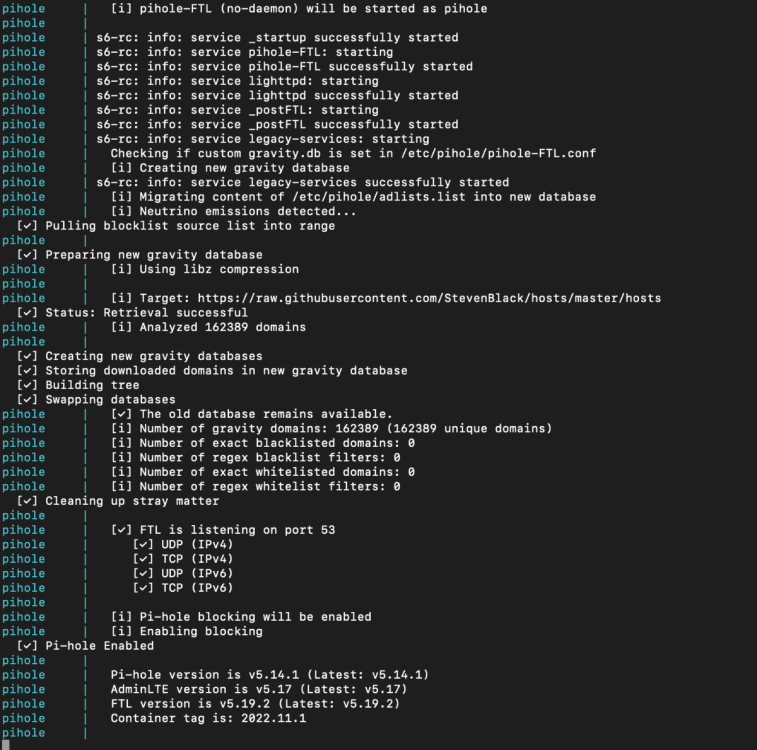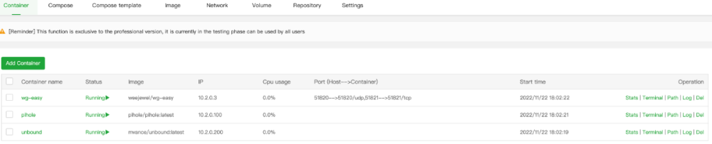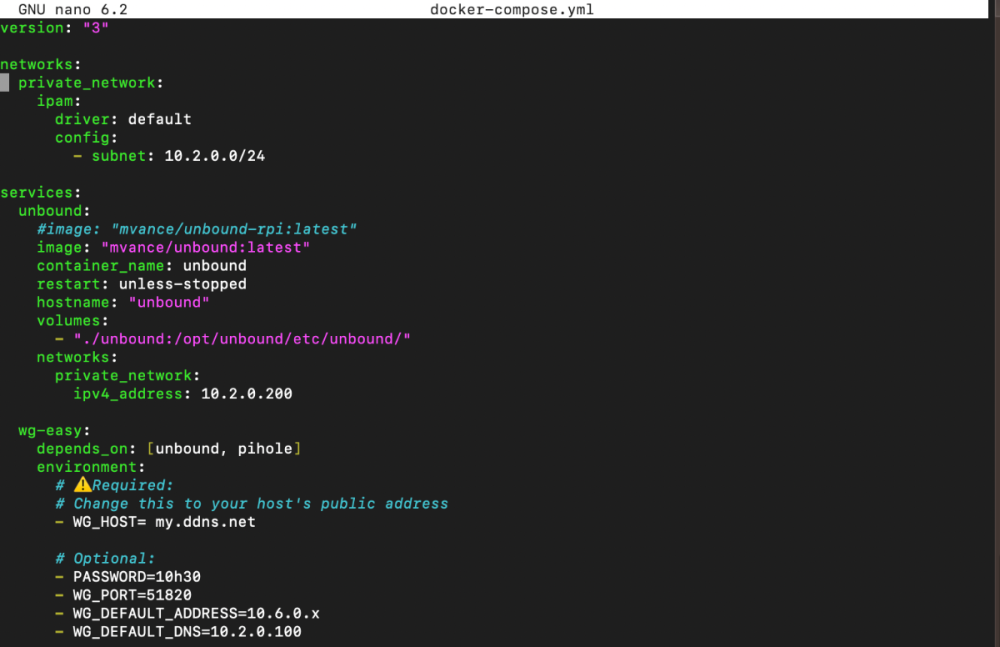UPD: Тема и сборка является устаревшим вариантом! Рекомендуется переход на DWG-UI. Всем привет Сегодня статья по теме создания собственного VPN сервера. Wirehole - это готовый контейнер для docker-compose для легкой установки Wireguard, piHole и Unbound за буквально несколько минут. В нашем варианте используется сборка с UI интерфейсом Wireguard - wg-easy. И так, начнем. Будем считать что все манипуляции с сервером вы уже выполнили, настроили, обезопасили и научились маломальски пользоваться им. У нас для примера Ubuntu 22 0. Не забываем, что у нас должен быть установлен текстовый редактор, например nano (apt install nano). 1. Ставим docker и docker-compose. // Я делал по этой инструкции. sudo apt update sudo apt install apt-transport-https ca-certificates curl software-properties-common curl -fsSL https://download.docker.com/linux/ubuntu/gpg | sudo gpg --dearmor -o /usr/share/keyrings/docker-archive-keyring.gpg echo "deb [arch=$(dpkg --print-architecture) signed-by=/usr/share/keyrings/docker-archive-keyring.gpg] https://download.docker.com/linux/ubuntu $(lsb_release -cs) stable" | sudo tee /etc/apt/sources.list.d/docker.list > /dev/null sudo apt update sudo apt install docker-ce И проверяем статус: sudo systemctl status docker Проверяем запуск контейнера docker run hello-world Ставим docker-compose: sudo apt install docker-compose Тут описан вариант для Debian 11. 2. Ставим Wirehole - UI (All-in-one: WireGuard + Web UI + Adblock (via Pi-Hole) + DNS Caching (via Unbound)) (github) Это самый лег этап ? git clone https://github.com/dignezzz/wirehole-ui.git cd wirehole-ui nano docker-compose.yml Зайдя в редактор, стоит обратить внимание на две вещи: 1. Обязательно нужно заполнить wg-host. Его можно указать как IP адрес сервера. ВНИМАНИЕ! Пробела после "WG-HOST=" не должно быть перед IP Адресом! 2.Второе важное: PASSWORD=10h30 - поменяйте на свой пароль для доступа к веб-интерфейсу. 3. Опционально, можно поменять временную зону - но это не обязательно. Сохраняем (ctrl+O) и жмем Enter Выходим из редактора (ctrl+X) Основные настройки на этом заканчиваются. Поднимаем контейнер: docker-compose up если результат такой, то я вас поздравляю с установкой: Статус контейнеров в aaPanel будет выглядеть так: ГОТОВО! Зайти в панель Wg-easy по адресу: ваш.ip:51821 панель piHole доступна только из внутренней сети после подключения через vpn по адресу: http://10.2.0.100/admin Не забываем сделать все безопасно: