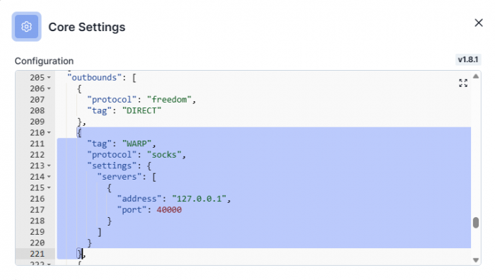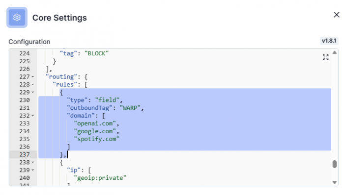 ShadowSocks решения: Marzban | Marzban Node | x-ui | 3x-ui Мануал получился достаточно случайно. Было обсуждение в чате по SS.. И вот на одном из сайтов нашел подсказку, про использование Warp в качестве локального прокси сервера. Давайте для начала разберемся для чего это может быть полезно: Можно пустить весь трафик сервера через warp для доступа к OpenAI с тех серверов, на которых его нет. Можно дополнительно зашифровать весь трафик отправив его через warp Потенциальные минусы: Снижение скорости работы и увеличенный ping. Пора к делу! На самом деле всё довольно просто, но в конфигурации с DWG сборками еще работа не проверялась. Вся информация есть на оф сайте: Announcing WARP for Linux and Proxy Mode (cloudflare.com) Дополнительно читаем про добавление ключей: Cloudflare Package Repository (cloudflareclient.com) А теперь пример реальный, на Ubuntu: Добавляем GPG key: curl https://pkg.cloudflareclient.com/pubkey.gpg | sudo gpg --yes --dearmor --output /usr/share/keyrings/cloudflare-warp-archive-keyring.gpg Добавляем репозиторий: echo "deb [arch=amd64 signed-by=/usr/share/keyrings/cloudflare-warp-archive-keyring.gpg] https://pkg.cloudflareclient.com/ $(lsb_release -cs) main" | sudo tee /etc/apt/sources.list.d/cloudflare-client.list Обноляемся: sudo apt update Ставим sudo apt install cloudflare-warp Теперь настраиваем. 1. Всю помощь получаем тут: warp-cli --help 2. Нужно зарегистрироваться: warp-cli register 3. Теперь выставить режим работы (possible values: warp, doh, warp+doh, dot, warp+dot, proxy), я выбираю proxy: warp-cli set-mode proxy Вы можете попробовать и другие варианты.. для эксперимента.. 4. Используем. В моем случае я использовал с панелькой 3х-ui: MHSanaei/3x-ui: Xray panel supporting multi-protocol multi-user expire day & traffic & ip limit (Vmess & Vless & Trojan & ShadowSocks) (github.com) 5. ГОТОВО. Теперь доступ к ресурсам отмеченных галочкой - у нас есть. О том как поставить x-ui, что это, как использовать и как настроить - будет отдельная статья..