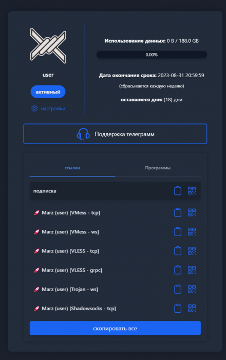 ShadowSocks решения: Marzban Full | Marzban Quick | Marzban Node | x-ui | 3x-ui | 3x-ui Docker Всем привет! Данная статья является устаревшей, рекомендуется переход на DEV ветку. В ближайшее время выйдет новая статья. Будет доступна только по подписке в Клубе Marzban. Переход на DEV ветку расписан в ЭТОЙ статье: Данная статья устарела. Рекомендую приобрести подписку и получить доступ к самой актуальной информации по Marzban Пока спал хайп на неработающий WireGuard, потому что он пока временно работает снова.. Хотел бы затронуть тему детальной настройки. Что мы сделаем в этой статье: Арендуем сервер Установим с нуля Marzban Установим сертификаты на домен Настроим docker-compose.yml Настроим .env файл и включим режим Proxy в CF. () (потенциально не работает Trojan протокол в этом режиме) Настроим продвинутую версию бота Настроим продвинутую версию клиентского интерфейса (страница подписки) Настроим WARP Proxy на Marzban через редактирование xRay core. Поехали! Marzban (персидское слово, означающее "граница" - произносится /мэрзбан/) - это инструмент управления прокси, который обеспечивает простой и удобный пользовательский интерфейс для управления сотнями прокси-аккаунтов, работающих на основе Xray-core и созданных с использованием Python и Reactjs. Почему рекомендую использовать Marzban? Marzban - это удобный, функциональный и надежный инструмент. Он позволяет создавать различные прокси для ваших пользователей без необходимости сложной конфигурации. С помощью встроенного веб-интерфейса вы сможете отслеживать, изменять и ограничивать пользователей. Возможности: - Встроенный веб-интерфейс - Работа в Docker. - Полностью поддерживает REST API - Поддержка нескольких узлов (для распределения и масштабируемости инфраструктуры) - Поддержка протоколов Vmess, VLESS, Trojan и Shadowsocks - Мультипротокол для одного пользователя - Множество пользователей на одном входящем - Множество входящих на одном порту (поддержка резервных вариантов) - Ограничения трафика и срока действия - Периодические ограничения трафика (например, ежедневные, еженедельные и т. д.) - Совместимая с V2ray ссылка на подписку (например, V2RayNG, OneClick, Nekoray и т. д.), Clash и ClashMeta - Автоматическое создание ссылок для обмена и генератор QR-кодов - Мониторинг системы и статистика трафика - Настраиваемая конфигурация xray - Поддержка TLS и REALITY - Встроенный Telegram Bot для админов - Интегрированный интерфейс командной строки (CLI) - Поддержка множества языков 1. Нам нужно арендовать хороший и быстрый сервер. Например можно рассмотреть: * Aeza: получаем бонус 15% (если пополнить в первые 24часа регистрации) на пополнение баланса: https://aeza.net/?ref=377137 * На крайний случай 4vps: 4VPS.su (2Гб\с сервера) 1.1. Регистрируемся по ссылке. 1.2. Выбираем желаемую страну. Но по моему опыту тестирования всех локаций, самые лучшие скорости в РФ у серверов в Дании и в Швейцарии. 1.3. Получаем адрес, логин и пароль. 1.4. Заходим через SSH клиент. 2. Устанавливаем Marzban также из официально репозитория: sudo bash -c "$(curl -sL https://github.com/Gozargah/Marzban-scripts/raw/master/marzban.sh)" @ install Идёт установка: 2.1. Пока идёт установка, идём в CloudFlare и добавляем доменную А запись: В поле Name напишите имя поддомена, допустим proxy, и в итоге адрес панели Marzban будет proxy.vashdomain.ru В поле IPv4 address пропишите IP адрес вашего сервера Имя поддомена конечно вы можете использовать любое, домен соответственно - ваш. Упомянутую доменную A запись также можно добавить напрямую у своего доменного регистратора, вместо делегирования домена на Clo