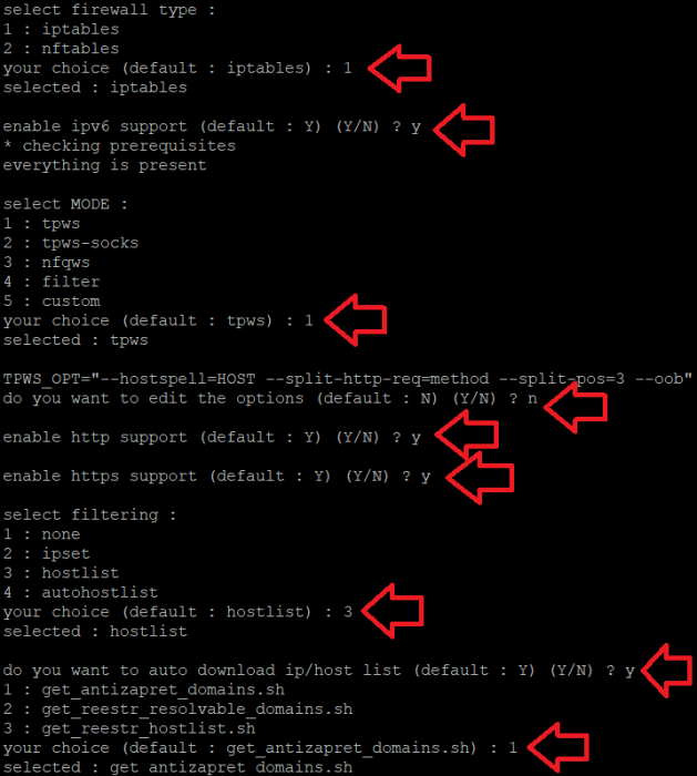 Ищете легкие способы? Вам сюда. OpenWRT Я ставлю все на локальный диск от root. Гайд может не работать на Вашей версии OpenWRT или на устройстве в целом. Настоятельно рекомендую сделать бэкап конфига. Предполагается, что Вы знаете, что делаете!! Нужно: Собственно, само устройство с OpenWRT. Подключение к инету. PuTTY или любой другой SSH-клиент на Вашем устройстве. Пароль root. Что делаем: Подключаемся по SSH и обновляем пакеты: opkg upgrade затем opkg list-upgradable | cut -f 1 -d ' ' | xargs -r opkg upgrade Устанавливаем Entware: wget -O - http://entware-3x.zyxmon.org/binaries/armv7/installer/install_std.sh | sh Добавляем переменные окружения: echo ". /etc/profile" >> /root/.profile && export PATH=$PATH:/opt/bin && export PATH=$PATH:/opt/sbin Добавляем псевдонимы для opkg, так как сейчас их в системе два. Первый - в /bin/opkg, второй - в /opt/bin/opkg, псевдоним первого - opkg, второго – opkg echo "alias opkg=\"/bin/opkg\"" >> /root/.profile && echo "alias opkg2=\"/opt/bin/opkg\"" >> /root/.profile Затем перезагружаемся reboot После перезагрузки OpenWRT нужно прописать opkg update, иначе будет ошибка. Устанавливаем необходимые пакеты: opkg install bind-dig cron dnsmasq-full ipset iptables shadowsocks-libev-ss-redir shadowsocks-libev-config git git-http nmap ncat ca-bundle Заходим в домашнюю папку и клонируем репозиторий: cd ~ && git clone https://github.com/bol-van/zapret.git Переходим в папку и запускаем установку: cd zapret && ash install_bin.sh && ash install_easy.sh Соглашаемся на копирование, вводим 1, y, y, y, потом 1, n, y, y, 3, y, 1. Если Вам не выдало никаких ошибок - OpenWRT настроен на обход ограничений! UPD от 30.08.2024: как добавить домены для обхода? Открываем файл: vi /opt/zapret/ipset/zapret-hosts-user.txt Если у Вас нет такого файла, значит, hostlist не включен, и нужно переконфигурировать zapret: ash /opt/zapret/install_easy.sh Если Вы не меняли стандартную настройку, вводите так же, как на скрине. Если меняли, повторите ее, включив hostlist. Стираем nonexistent.domain и вводим нужный. Каждый домен вводится с новой строки. Не забудьте про пустую строку в конце файла, не убирайте ее! Перезагрузите систему, и готово!